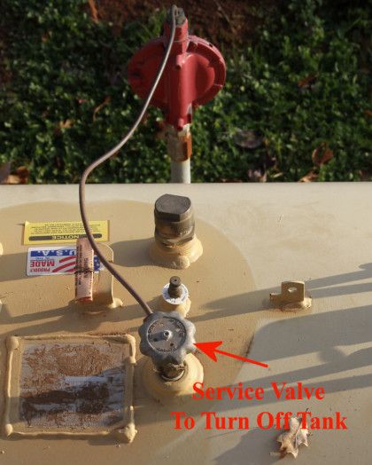 If you smell a strong odor of propane gas,when you are outdoors shut off propane gas at the tank by turning off the SERVICE VALVE (see photo for service valve location) and call us (530-633-2626) immediately.